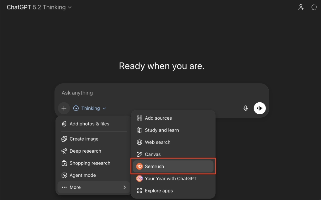 Semrush launched an official app in ChatGPT on December 17th. This is a first-party integration built using OpenAI’s Model Context Protocol (MCP) infrastructure. You’re not installing a third-party plugin or running a hacky workaround. It’s official, and it works like any other ChatGPT app.